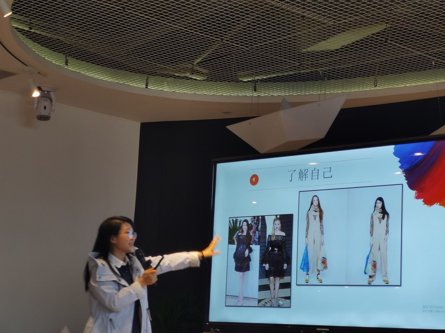 孔卿老师利用PPT授课模式,首先讲述了色彩的基本原理及应用,同时告诉大家服装色彩是服装感观的第一印象,具有极强的吸引力,并对服装色彩分析以及日常生活中服装搭配技巧进行了全面的讲解。例如:日常生活中穿什么样的服饰最搭配、通过什么样的服装搭配手法遮挡住自身身材的缺陷,展现出自己的身材优势,从而让自己自信起来。为了让大家直观理解色系搭配法则,结合人们不同身材特点,提供了大量的图片及现场案例进行分析,教其如何穿出适合自己的时尚服饰风格。孔卿老师在讲课过程中通过结合课程内容和图片的对比以及现场的参加者的服饰搭配范例的讲解让课程内容更加形象易懂,充分调动了大家的积极性,给大家留下了深刻的印象。
