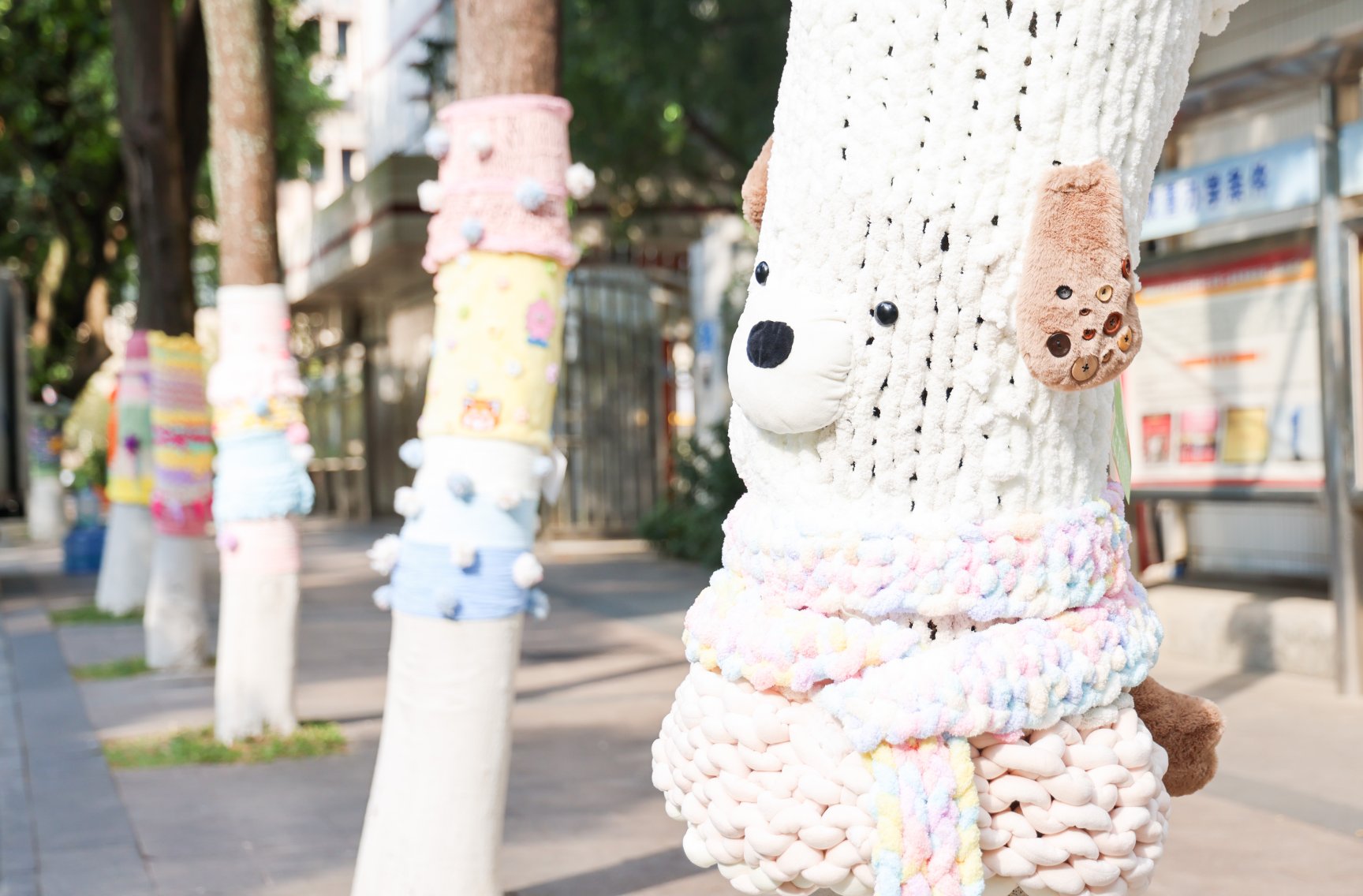 本次展览由太阳成tyc33455cc主办,公共艺术专业2023级1班员工与公共艺术专业美育工作室(307)联合呈现,将课堂从教室延伸至自然之中,同学们以毛线为媒介、旧衣为灵感,为树木编织起独一无二的“冬日衣裳”。