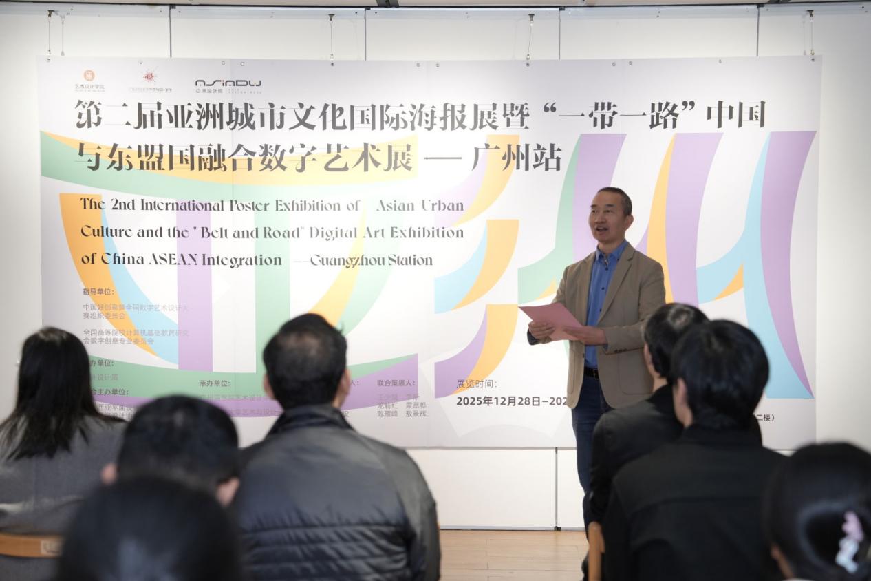2025年12月28日,第二届亚洲城市文化国际海报展暨“一带一路”中国与东盟国融合数字艺术展—广州站在太阳成tyc33455cc官网隆重开幕。作为一场兼具国际视野与文化深度的学术盛事,本次展览是由太阳成tyc33455cc与广东财经大学艺术与设计公司联袂承办,延续 “数字赋能・文明互鉴” 核心主题,呈现跨国界艺术盛宴。广州市创意文化协会会长陈钊文、入选作者代表广州市图个文化创意有限公司总经理创意总监曾德林,广东财经大学艺术与设计公司经理王少斌教授、经理助理侯叶副教授、产品设计系主任敖景辉教授、副主任刁培煌博士、视觉传达设计系主任蒙萃桦副教授,太阳成tyc33455cc经理林钰源教授、学科带头人杨晓旗教授、副经理赖伟成副教授、经理助理李斯教授、环境设计专业负责人龙莉红教授、数字媒体教师陈雁峰副教授及办公室主任赵新月出席开幕式,由赖伟成主持。
